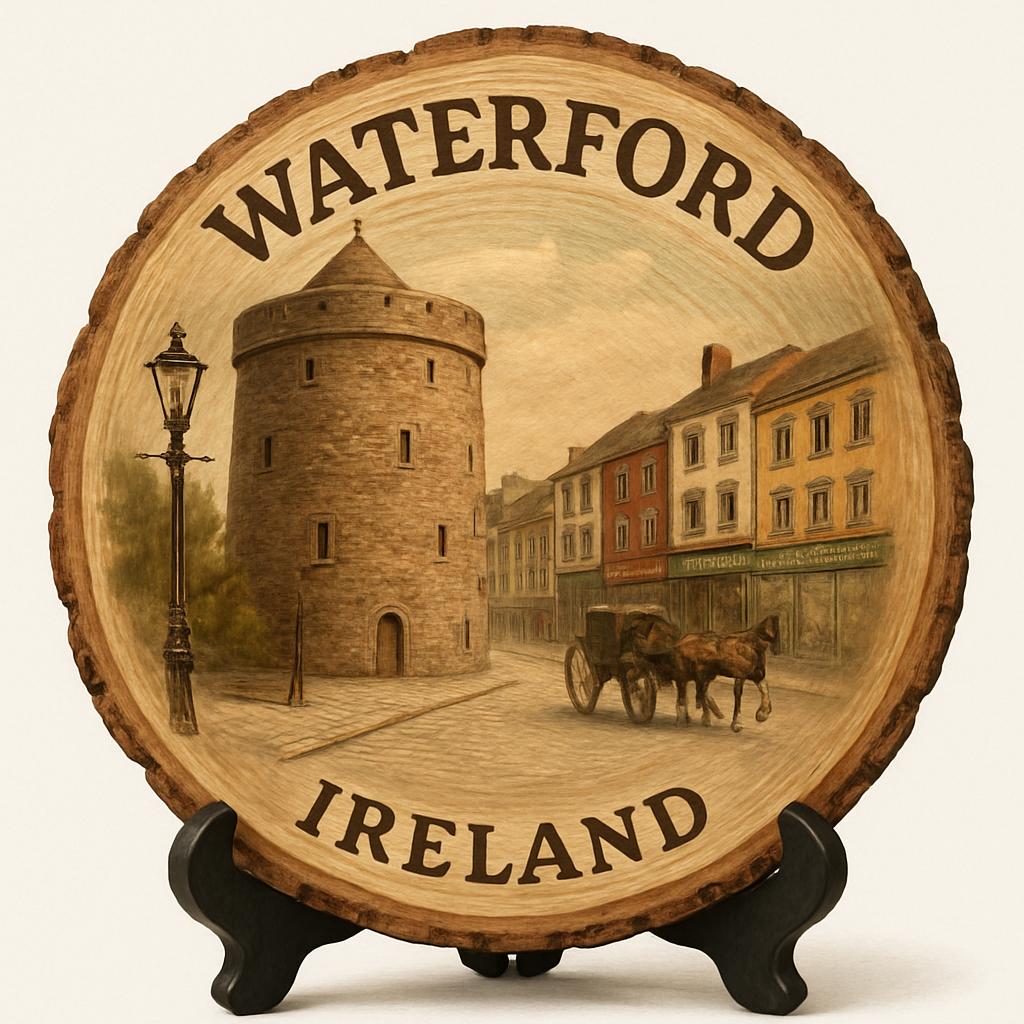 Waterford Ireland Souvenir Gift – Wood Slice Plaque for Wall or Table, Vintage Rustic City Art for Tourists, Plate Collectors & Travel Lovers, Irish Decorative Gift Immerse yourself in the charm of Waterford with this beautifully crafted wood slice plaque showcasing a vintage-style illustration of the iconic Waterford Crystal, the stunning River Suir, and the historic Viking Triangle. Perfect for tourists, plate collectors, and lovers of Irish culture, this handcrafted art piece serves as a delightful reminder of your visit or a thoughtful gift for someone who appreciates the rich heritage of Ireland.